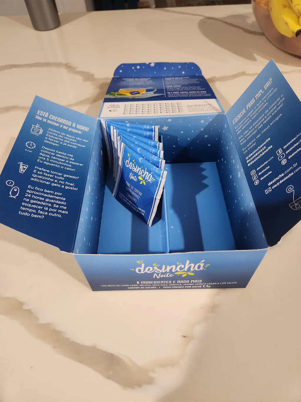Desinchá is crafted with a blend of 8 natural herbs that work in synergy to promote detoxification and reduce bloating. The ingredients like green tea, ginger, and guaraná have properties that help boost metabolism, enhance digestion, and support fluid balance, making it an effective choice for those looking to support their weight loss journey and overall health.